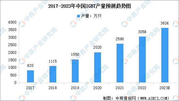 IGBT被称为电力电子行业里的“CPU”,广泛应用于电机节能、轨道交通、新能源汽车等领域。目前在轨道交通领域已经实现技术突破,在新能源汽车领域,IGBT是电控系统和直流充电桩的核心器件,我国IGBT产量快速增长。2019年、2020年、2021年我国IGBT的产量分别为1550万只、2020万只和2580万只,预计到2023年将产量将增长至3624万只。